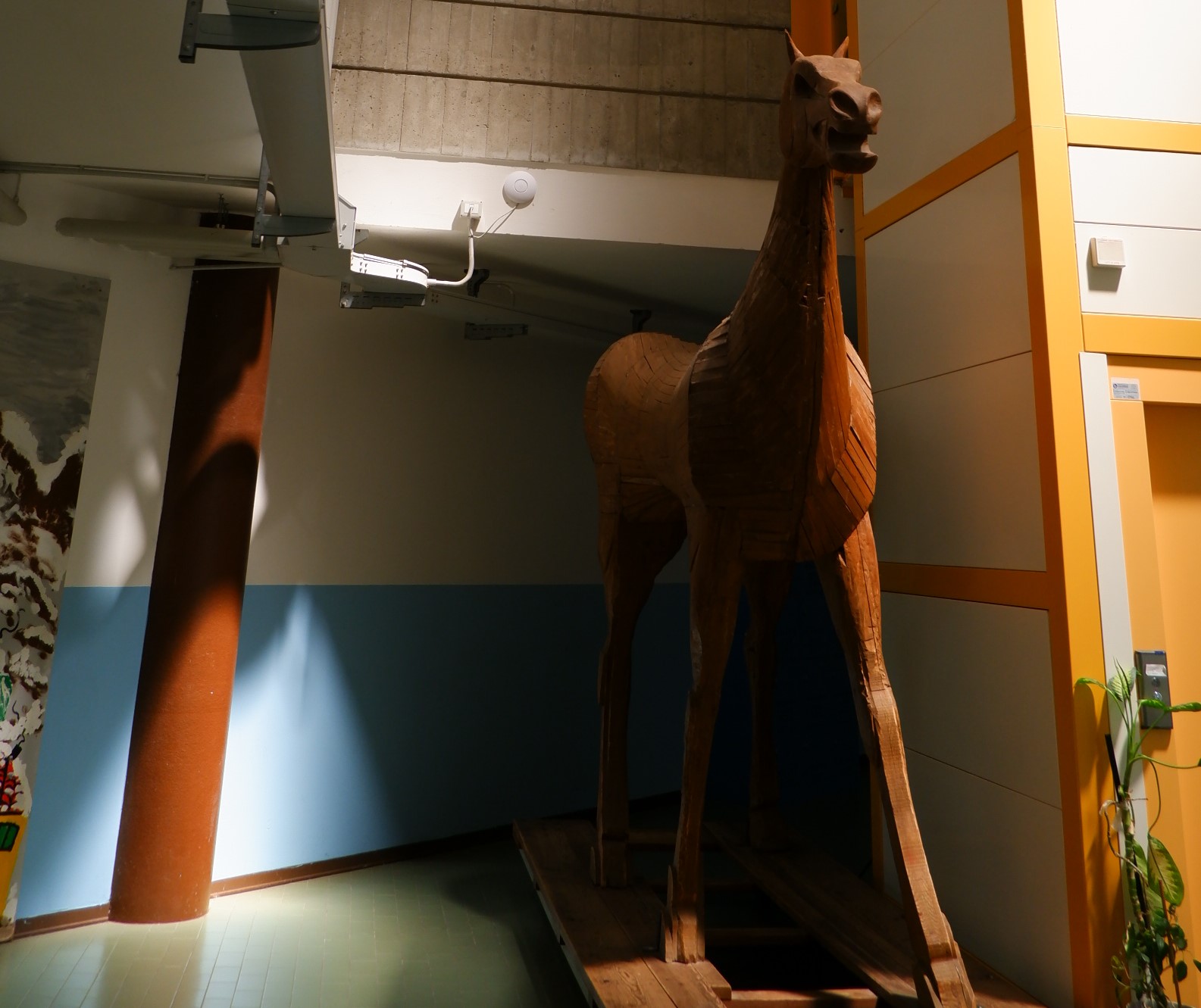 La storia dell'Istituto Comprensivo Gabriele D'Annunzio è il risultato di due istituzioni del territorio di Jesolo lido: il Circolo Didattico marina che ha incluso fino a tre scuole primarie (Carducci, Colombo e Monteberico) e la Scuola media Grabriele D'Annunzio, istituita nel 1964. Nel 1972 viene costruito l'attuale sede centrale dove, chiunque entri passando dalla portineria, difficilmente non potrà notare il maestoso cavallo di legno che dal 1978 è collocato nell'atrio. La sua storia è gloriosa e parla di apertura e integrazione, ma forse poco conosciuta. Il suo nome è Marco Cavallo Due. Durante l'estate del 1978 l'amministrazione di Jesolo decide di ospitare nei locali della sede centrale una mostra dedicata a quanto sta avvenendo a Trieste ad opera di Franco Basaglia, lo psichiatra che porterà all'apertura dei manicomi. Vengono esposte opere d'arte e organizzate feste nel cortile della scuola e in strada. E' la festa dei matti e a guidare il corteo c'è un cavallo azzurro, Marco Cavallo, costruito dai pazienti di Franco Basaglia in un laboratorio e fatto uscire dalle mura del manicomio di Trieste. Rapidamente diventerà un simbolo di integrazione, di libertà e di dignità. Marco Cavallo Due è un copia del primo Marco Cavallo, ora a Trieste, realizzato dallo scultore Vittorio Basaglia, cugino di Franco. Volutamente diverso dall'originale, ma smontabile, per essere più facilmente trasportato in giro per il mondo (sembra sia stata a Parigi e Londra) a testimoniare la sua carica di significato. A pensarla bene, il fatto che Marco Cavallo Due abbia trovato casa all'interno del nostro Istituto, è particolamente significativo, perché è difficile immaginare un posto migliore da una scuola per parlare di integrazione, libertà e dignità delle persone. Valori che teniamo a portare avanti tutti i giorni nella nostra funzione educativa e che sentiamo nostri. Marco Cavallo Due, che dal 1978 accoglie alla porta chi entra nell'edificio, è diventato un simbolo anche dell'Istituto D'Annunzio. A noi il compito di raccontare la sua storia ai nostri giovani studenti.